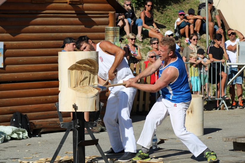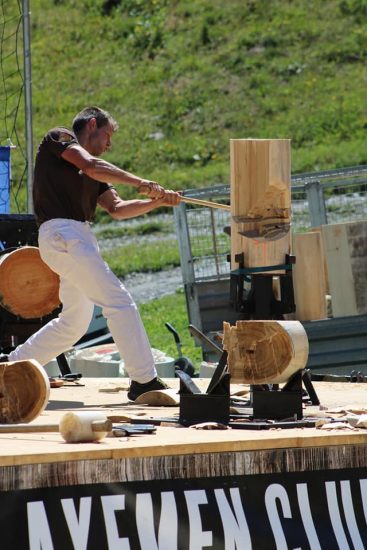 Cette discipline simule l’abattage d’un arbre à la hache. Un tronc de bois (diamètre de 30 cm) placé à la verticale doit être tranché latéralement le plus vite possible. Le point d’impact optimal du coup de hache ainsi que la force du coup sont d’une importance décisive pour triompher rapidement dans cette discipline. Les meilleurs temps européens réalisés dans cette discipline sont de l’ordre d’une vingtaine de secondes.