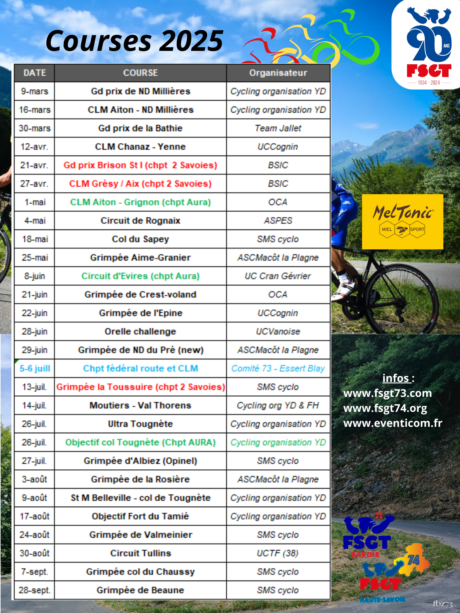 Pour les cyclistes qui ont envie de se tester et de se dépasser, de mars à septembre il y a des courses le samedi ou le dimanche. Un calendrier est établi chaque année (27 courses possibles en 2025). Un classement annuel est fait selon des catégories d’âge ou de valeur. Une entente Savoie / Haute Savoie est organisée pour ce classement mais aussi pour l’organisation des Championnats des 2 Savoie (CLM, Circuit et Grimpée). Même côté course, le rythme est libre et il y a de tout niveau : l’important c’est de terminer. En fin de course un pot est proposé par l’organisateur, riche en échanges et en sourires.