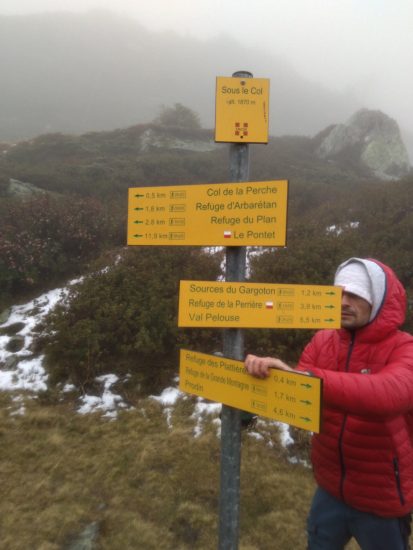 Daniel DUPUIS du club Belledonne Sports Nature et Guillaume du comité FSGT ont accompagné un agent de la Communauté de Communes Coeur de Savoie sur le sentier du GR 738 le jeudi 19 novembre malgré la mauvaise météo afin de changer des lames sur les poteaux directionnels.