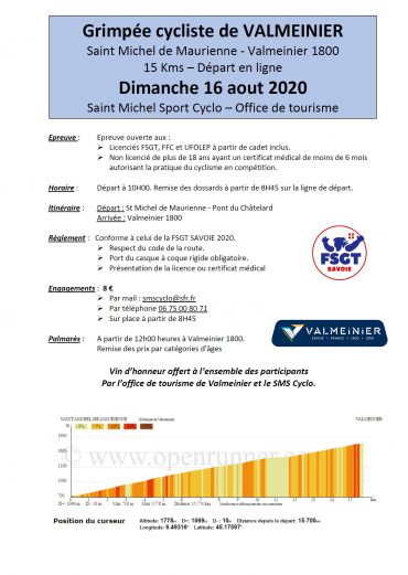 La Grimpée cycliste de VALMEINIER aura lieu le dimanche 16 août 2020 au départ de Saint Michel de Maurienne. Cette course cycliste FSGT est organisée par le club Saint Michel Sport Cyclo.