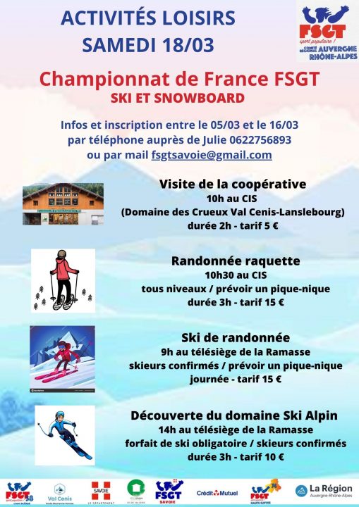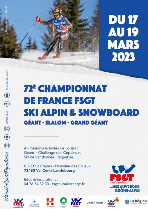 Le Comité Régional Auvergne Rhône Alpes FSGT, la Commission Fédérale d’Activité (CFA) Sports de neige et l’ensemble du Collectif d’organisation sont heureux de vous accueillir sur les 72èmes Championnats de France FSGTde Ski alpin et de Snowboard qui se dérouleront les 17 – 18 & 19 Mars 2023 à Val Cenis en Savoie (73).