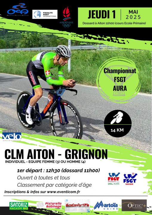 Le club de l’OCA organise le 1er mai 2025 le championnat Auvergne Rhône Alpes du Contre-La-Montre individuel et par équipes de 14,5km entre Aiton et Grignon.