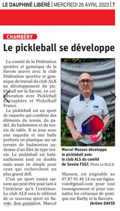 Le club ALS pratique le pickleball chaque semaine les lundi et vendredi de 19h à 21h30 au gymnase du 13ème BCA à Barby. Son président Marcel Masson est joignable au 07-87-91-46-14 ou sur fsgtsavoie@gmail.com pour tout renseignement et adhésion.