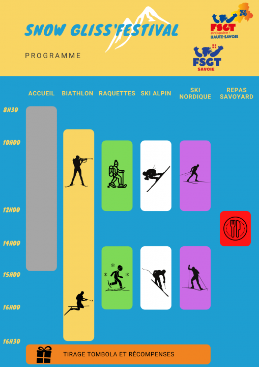 L’inscription à l’ensemble des activités du Snow Gliss’ Festival comprend le repas savoyard préparé pour l’occasion, dans une formule « plat + dessert + 1 boisson ». Le repas sera proposé de 12h à 14h.