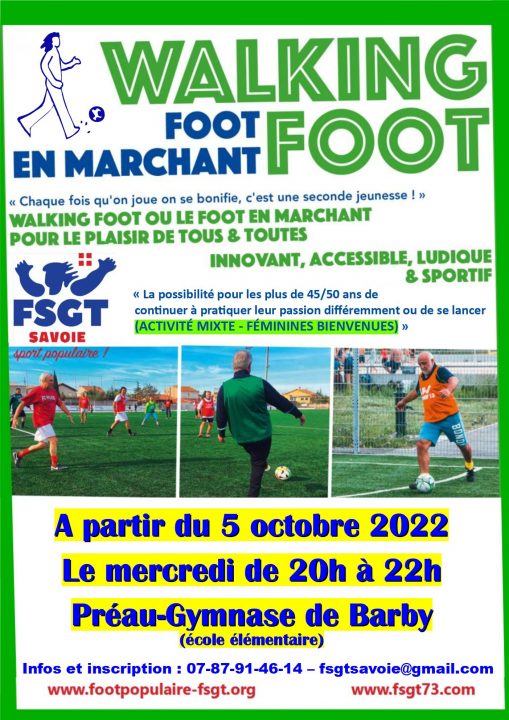LE WALKING FOOT OU FOOT EN MARCHANT est une nouvelle activité qui nous vient d’Angleterre. Ce sport permet aux plus de 45/50 ans de continuer à pratiquer leur passion différemment ou de s’y lancer (féminines bienvenues)… En France la FSGT développe cette activité avec ses propres règles (autoarbitrée) très simples : simples : obligation de marcher avec ou sans ballon, absence de contact avec l’adversaire, le ballon ne peut pas dépasser la hauteur des hanches, jeu à 5 contre 5.