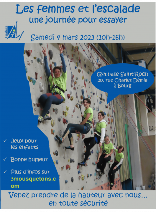 A l’occasion de la journée de la femme, le club des 3 mousquetons organise une journée de découverte spécialement dédiée aux femmes de 18 à 77 ans. Venez nombreuses découvrir l’escalade en toute sécurité!