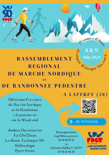 retour à l’agendaLe Comité Régional FSGT AURA et sa Commission Régionale de Marche Nordique vous invitent à participer au 1er Rassemblement Régional de Marche Nordique qui aura lieu les 8&9 juin 2024 à Laffrey en Isère.