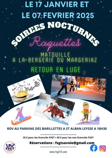 retour à l’agendaLe comité FSGT Savoie organise cette année 2 soirées raquettes matouille au Margériaz les vendredis 17 janvier 2025 et 7 février 2025.