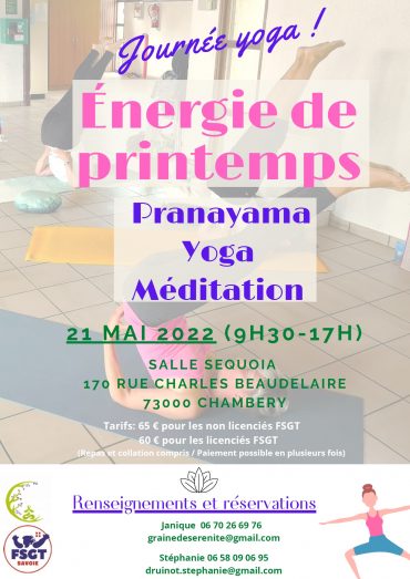 Une journée entière de pratique le 21 mai avec la FSGT Savoie et le club Sport Bien Être et Détente ! Ca se passe à Chambéry dans la salle du Séquoia (quartier Bellevue) en compagnie de 2 profs de yoga. La mission de la FSGT est de permettre à tous de pratiquer des activités sportives et de bien-être alors cette journée est ouverte à tous et le paiement en plusieurs fois est possible.