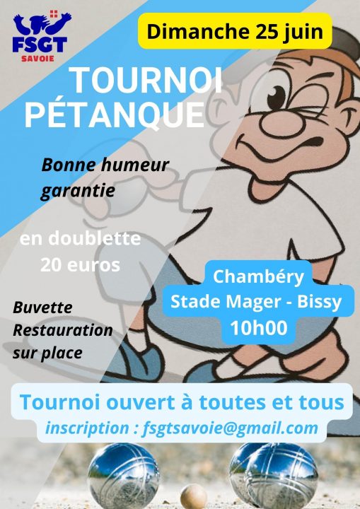 Le Comité FSGT Savoie organise un tournoi de pétanque le dimanche 25 juin 2023 au stade Mager (Chambéry) à partir de 10h.