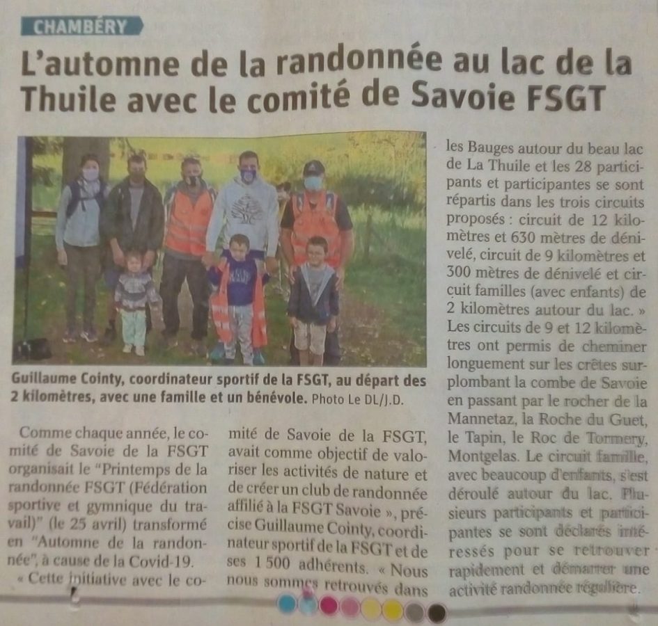 L’Automne de la randonnée organisée par le comité FSGT Savoie le samedi 19 septembre 2020 a permis à des randonneurs confirmés ou novices de se balader dans les Bauges autour du lac de la Thuile sur 3 circuits adaptés aux capacités de chacun. L’objectif de cette journée découverte est la création d’un club de randonnée FSGT sur le bassin chambérien.