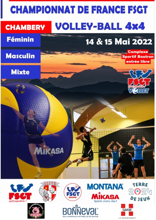 Le Championnat de France FSGT Volley 4×4 s’est tenu dans une belle ambiance à Chambéry les 14 et 15 mai 2022, organisé par la CFA Volley FSGT, le Comité FSGT Savoie et sa commission volley et le club de l’Amicale Laïque de Chambéry Volley Ball (ALCVB).