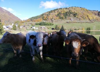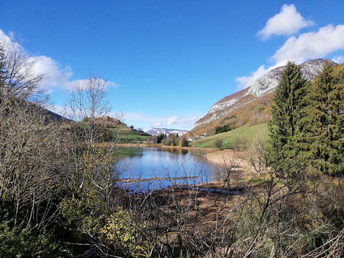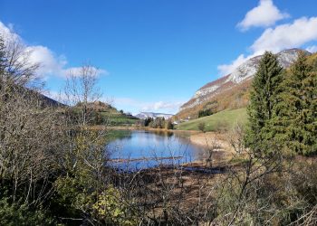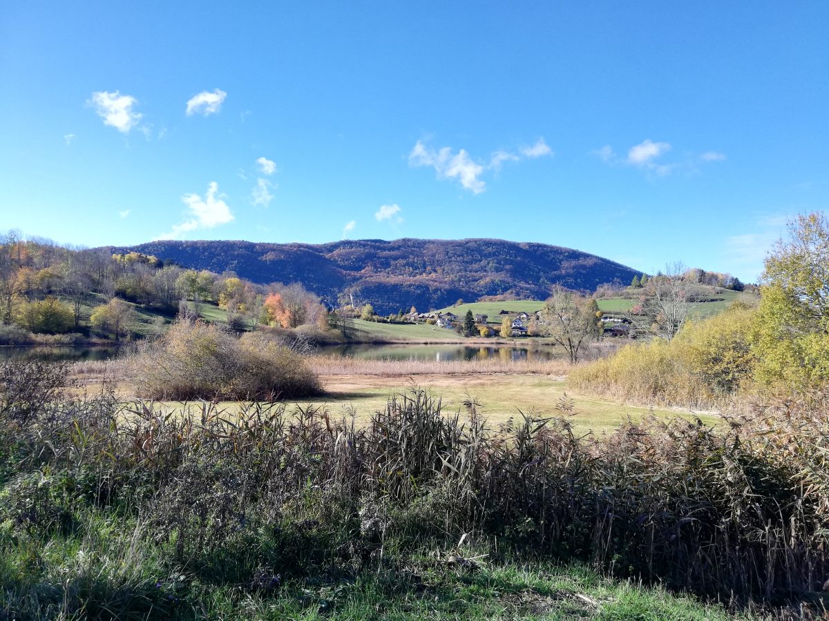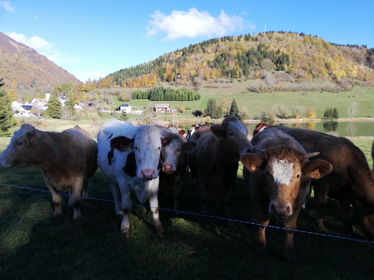 Encore quelques explications concernant cette fois-ci la boussole et c’est la pause repas. Le lac de la Thuile sous le soleil, les prairies vertes pâturées par les vaches et les couleurs d’automne sur la forêt nous offraient un beau spectacle.
