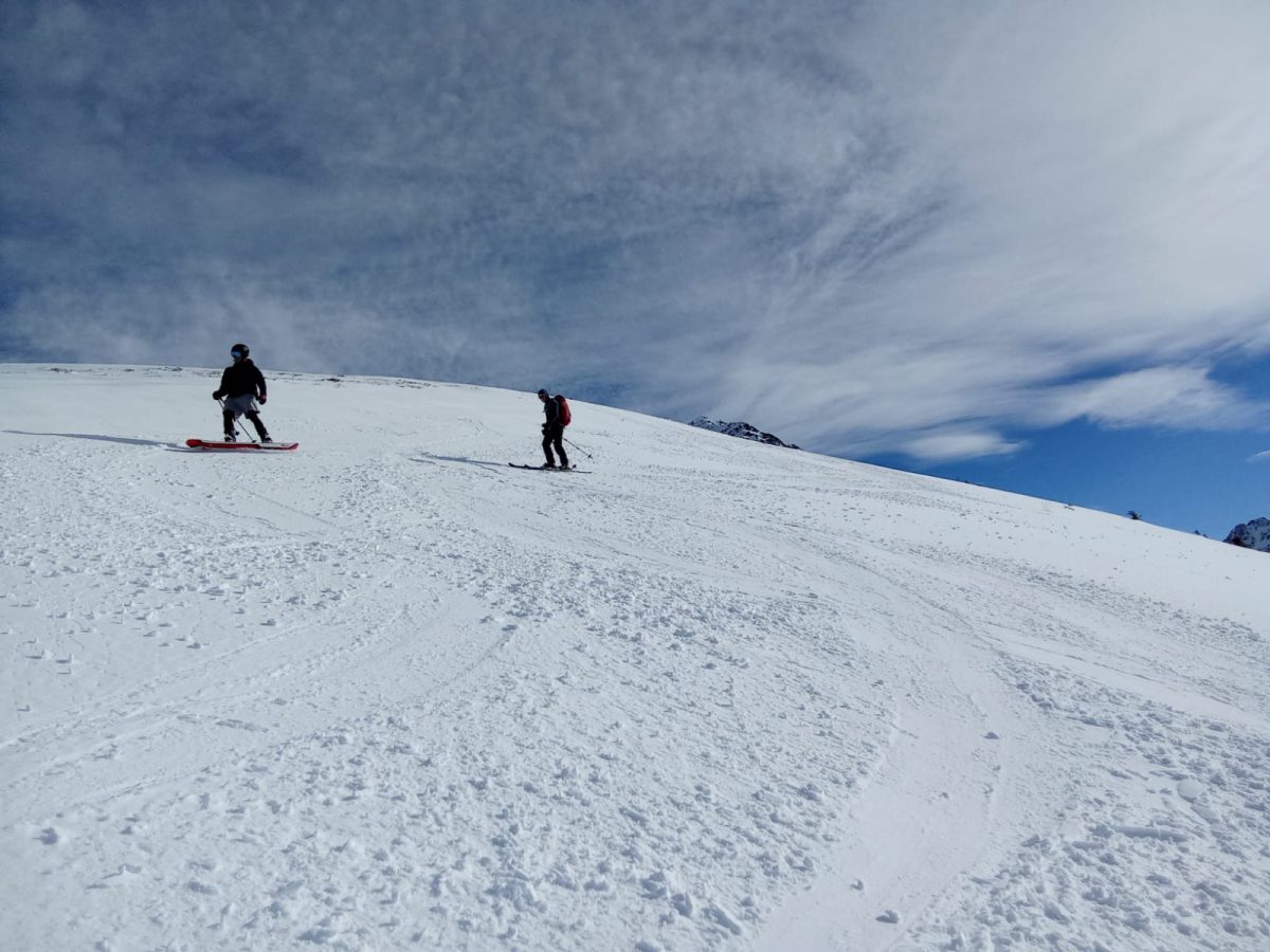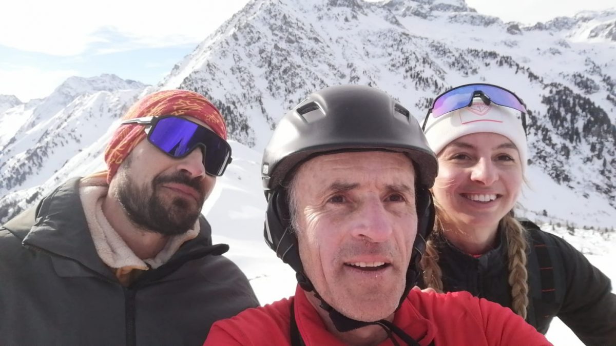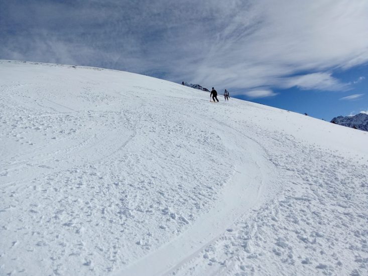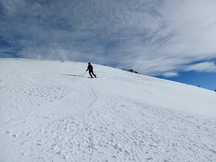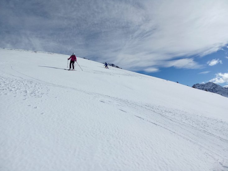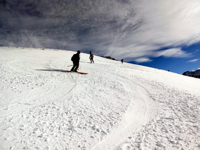 Après la photo devant la face nord des Grands Moulins, descente dans une neige agréable (quelques millimètres de poudreuse sur un fond dur!).