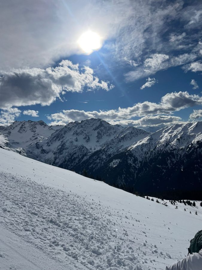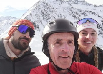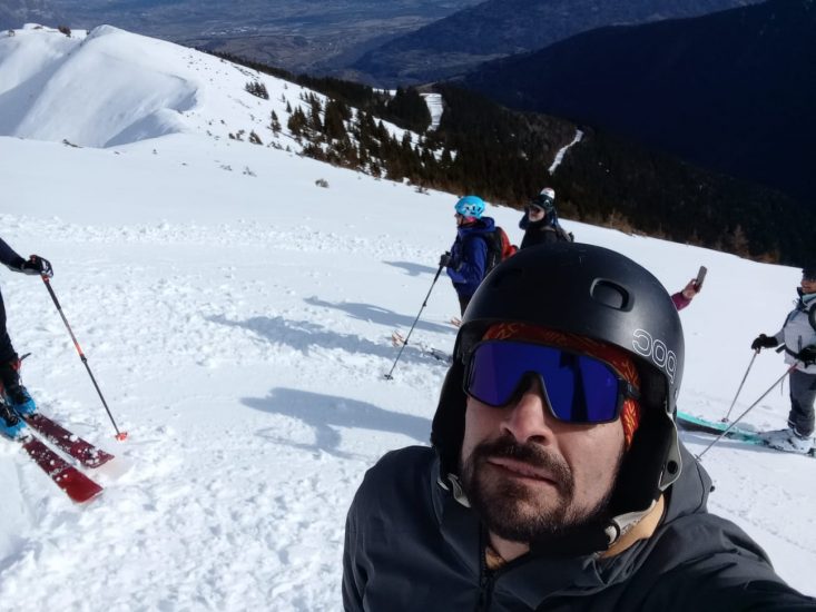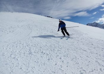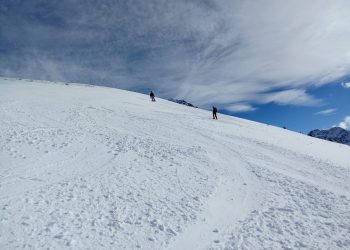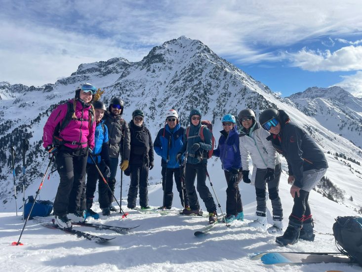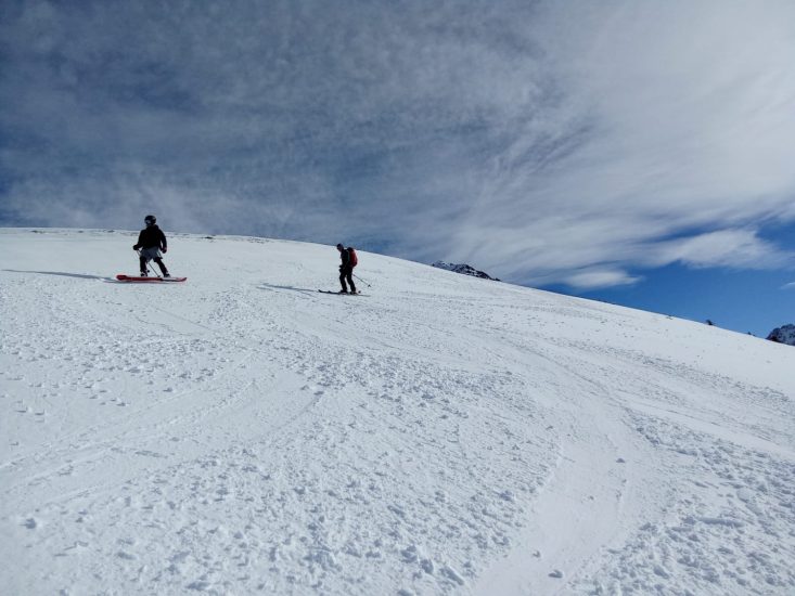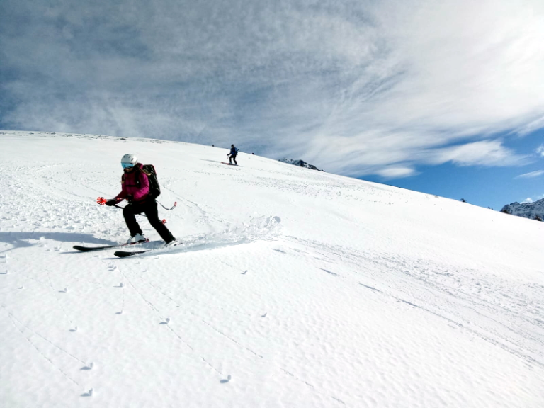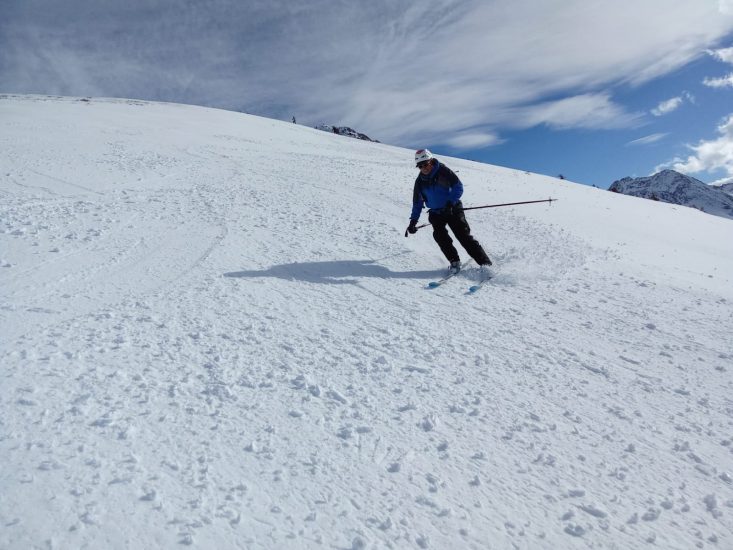 Après la photo devant la face nord des Grands Moulins, descente dans une neige agréable (quelques millimètres de poudreuse sur un fond dur!).