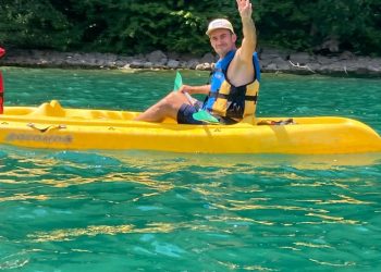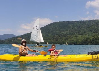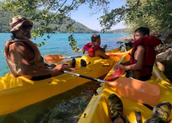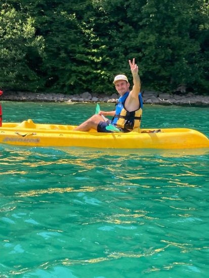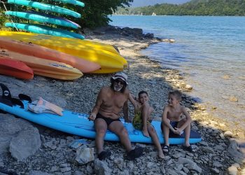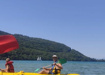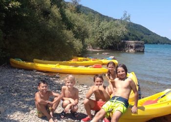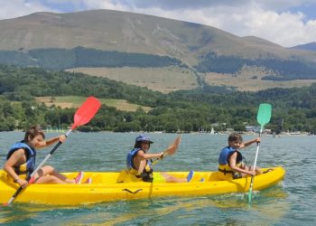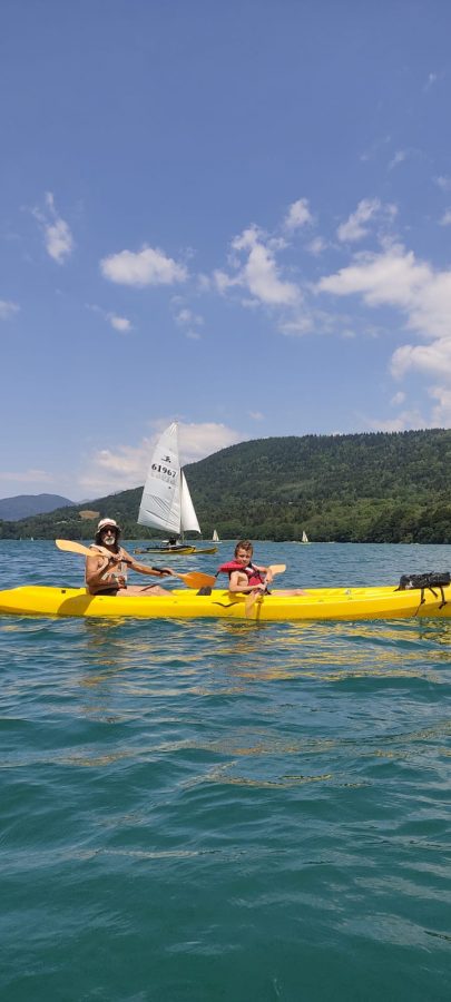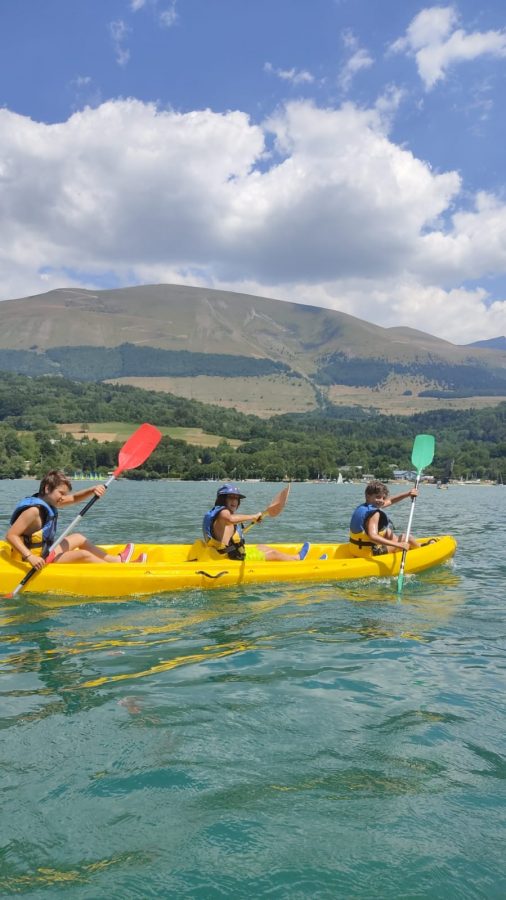 Le premier jour, la base nautique FSGT est notre terrain de jeu, nous partons à bord de 4 kayaks faire la moitié du tour du lac de Laffrey. Les Petits Chamois rament, se baignent et conduisent les kayaks à tour de rôle pour les plus débrouillards.