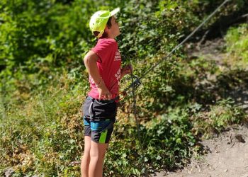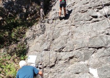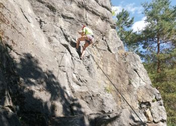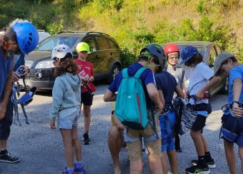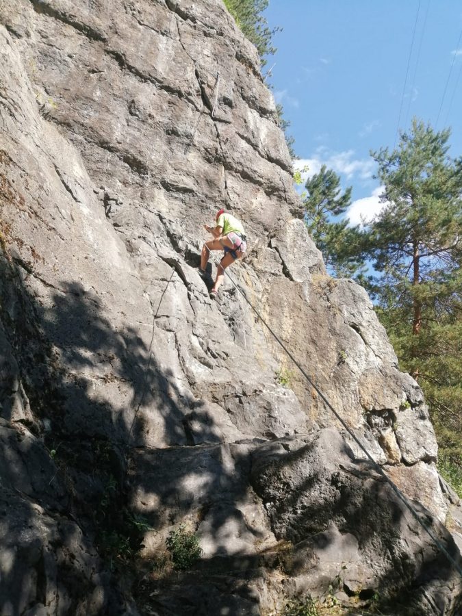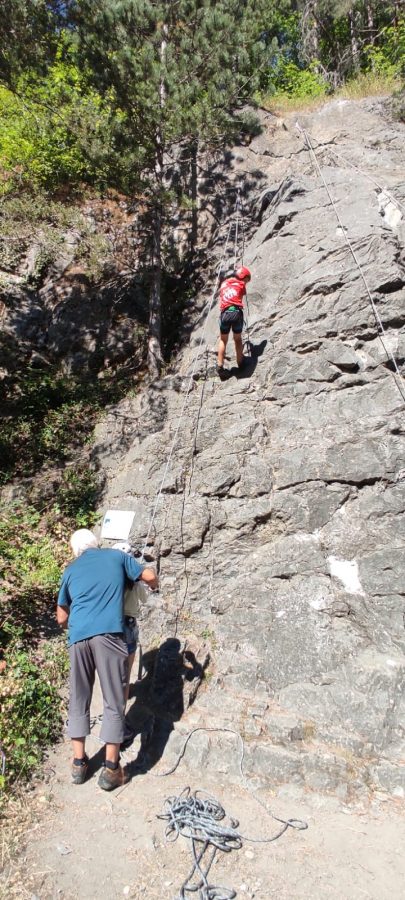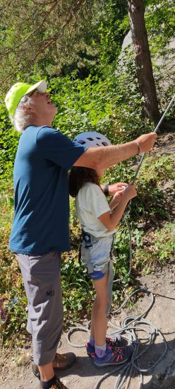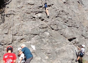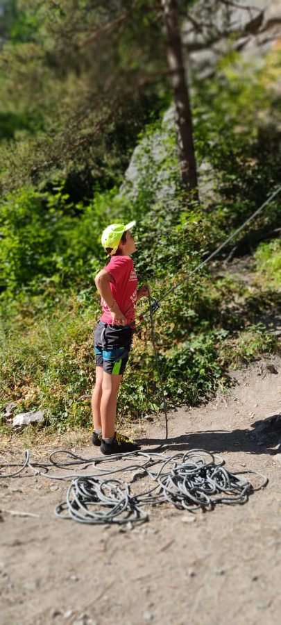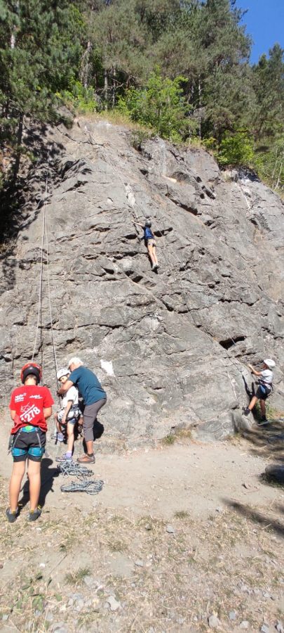 Initiation aux nœuds de huit et têtes d’alouette pour les débutants, montée en moulinette sur des voies allant du 3C au 5A. Les plus habiles sont montés en tête avec manipulation de corde au relais et à l’assurage (dégaines, vache, mousqueton).