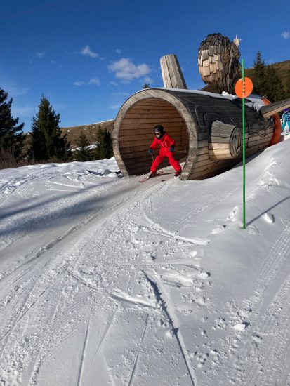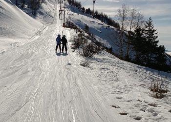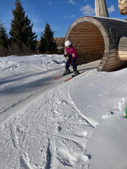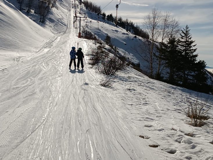 Trois accompagnants, Dominique (grand-père bénévole), Vincent (papa bénévole) et Camille, secondent Guillaume pour cette sortie, de sorte que des groupes de niveaux puissent être faits et que les enfants profitent chacun et chacune à leur rythme. Dominique et Camille guident les bouquetins, groupe débutant sur les skis qui sillonne les pistes vertes et bleues. Vincent mène les mouflons, skieurs confirmés qui apprécient les rouges. Et Guillaume…essaye de suivre son groupe de chamois qui passent des bosses aux hors pistes avec l’aisance qu’on leu connaît.