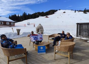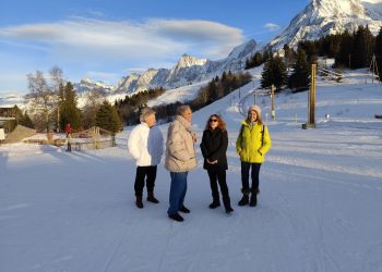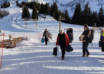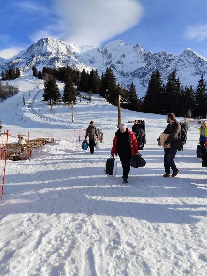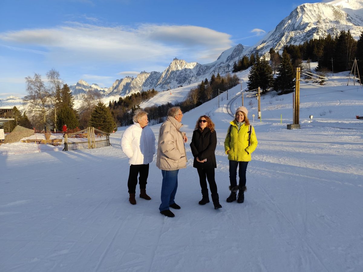 16 personnes se sont retrouvées à Saint Gervais pour prendre le train du Mont Blanc direction l’hébergement au « Col de Voza ». Arrivée originale, avec une traversée des pistes de skis avec les valises. Une immersion totale en pleine nature !