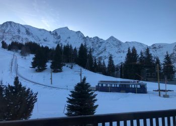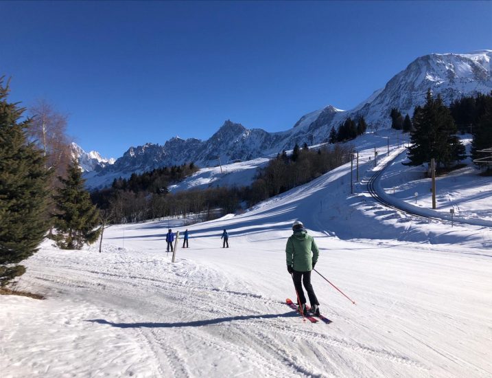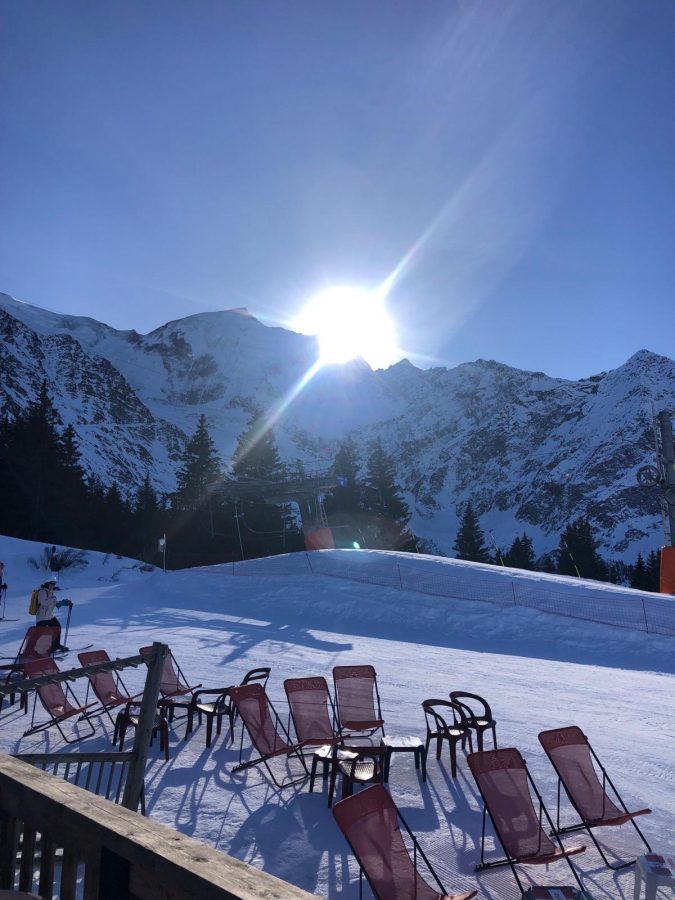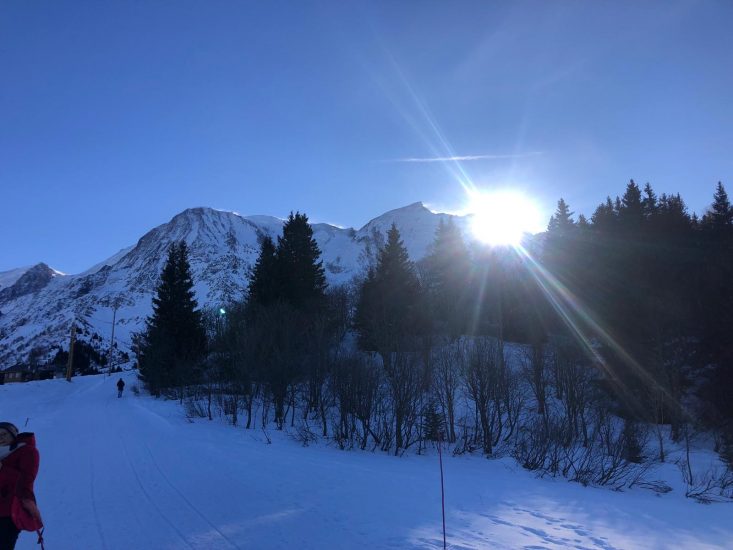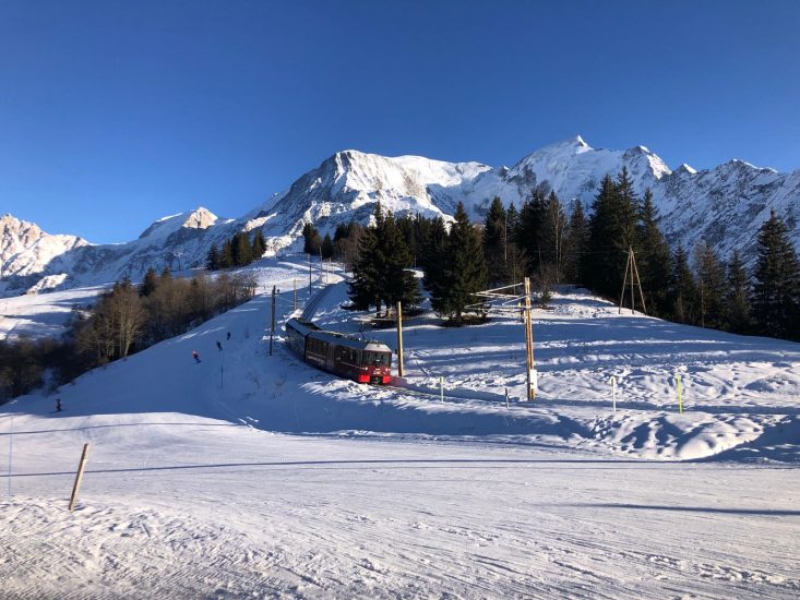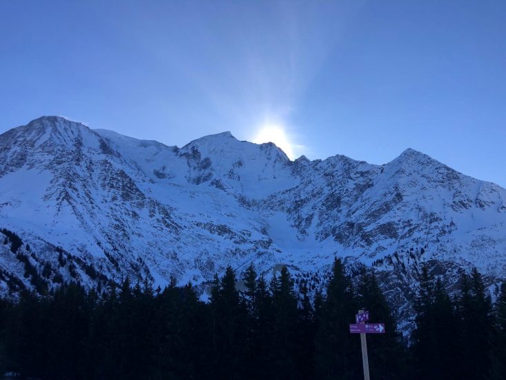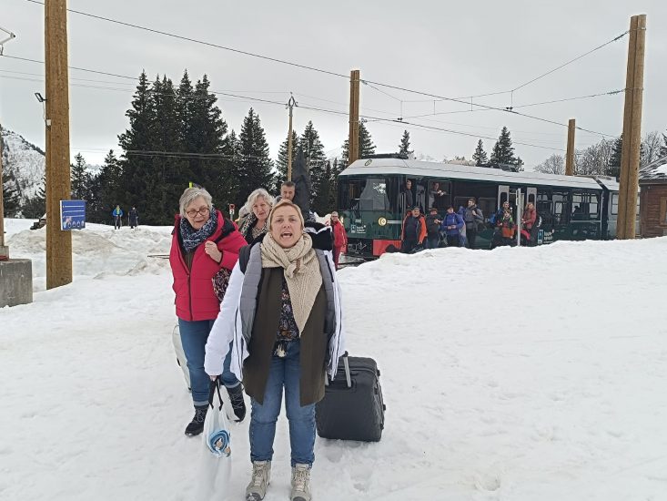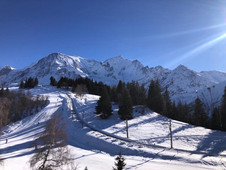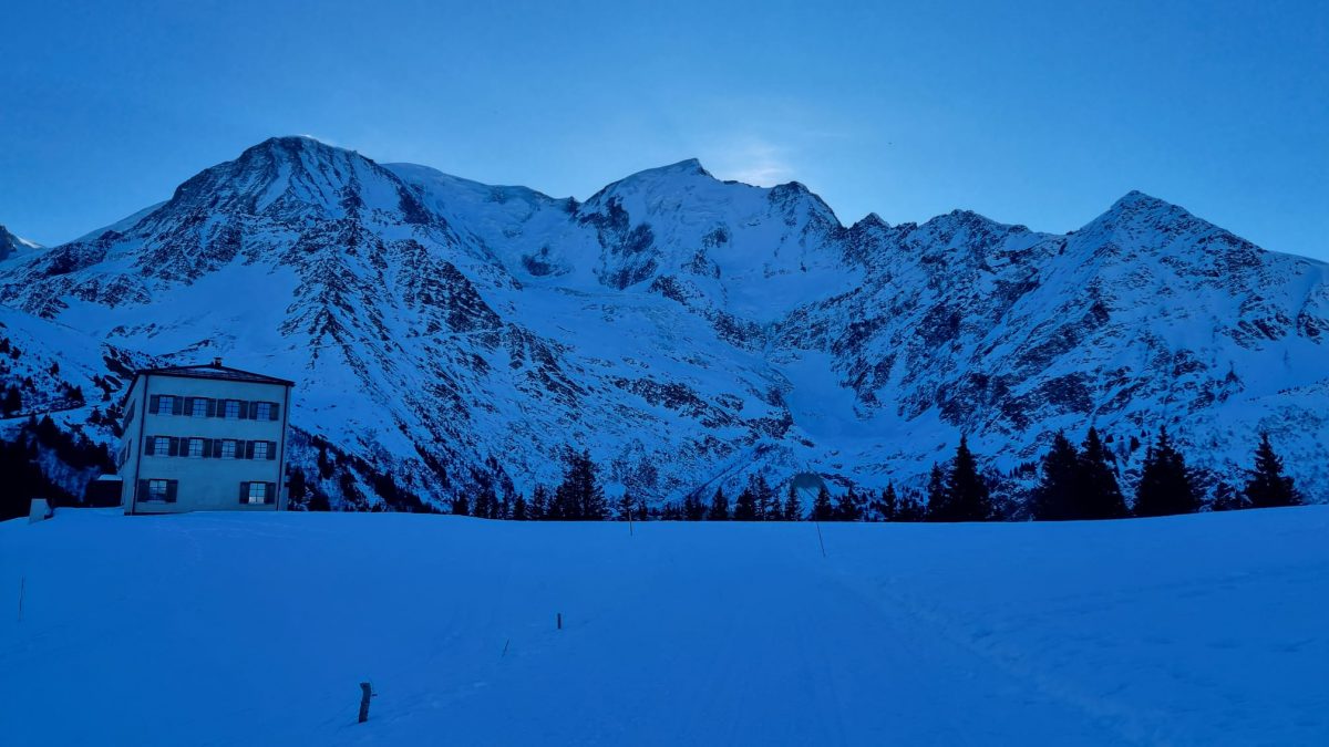 Début du week-end, on commence avec un excellent restaurant à Saint Gervais pour un repas convivial et faire connaissance. Nous sommes un petit groupe de 20 personnes comprenant des adolescents avec un esprit familial. Nous prenons le train du Mont Blanc pour arriver à notre hébergement au « Le Col de Voza ». Arrivée originale, on traverse les pistes de skis avec nos valises, lieux en immersion total sans voiture !